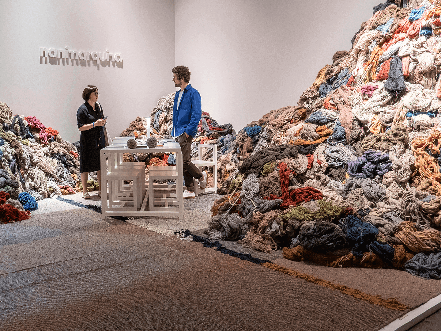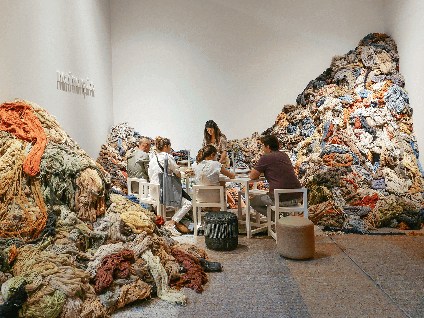 The stand, a new way of seeing waste, was an example of transparency and sustainability. Designed by ARQUITECTURA-G , it was divided into two different spaces. The main space was made up of mountains of wool, the actual sample of the wool recovered to design Re-Rug. And the second space, smaller in size, was a place where you could see the new collections first-hand. From Tones by Claudia Valsells, Troupe by Jaime Hayon to Tiles and Ceras by Nani Marquina. We also present the new pouf models, Tres pouf Outdoor and Shade Pouf Outdoor , which were created to respond to the strong demand for seats also for outdoor use.