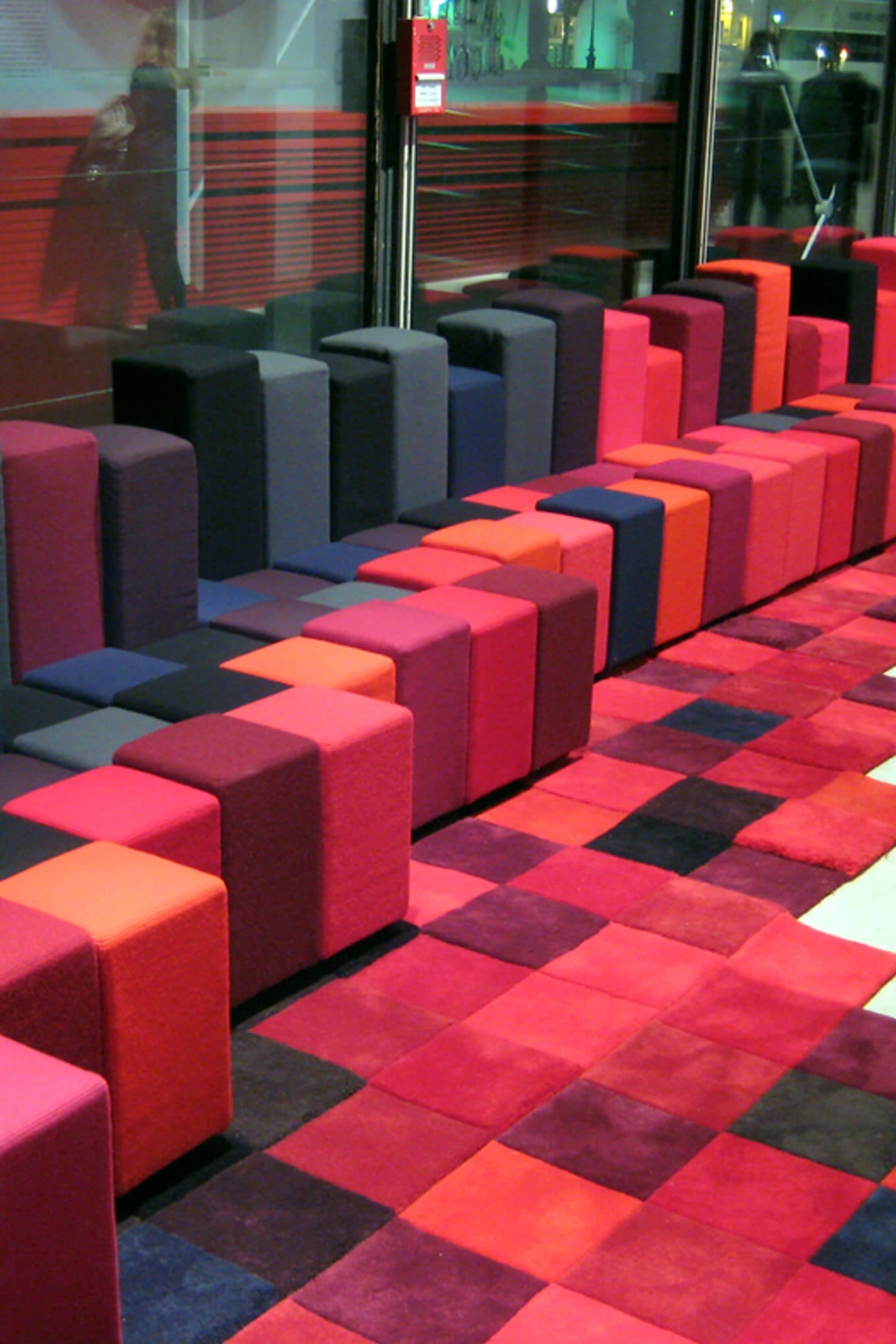 The special rug had to contain different heights and match the sofa from the Do-Lo-Rez collection . Following its initial design and adapting to the safety requirements of the showroom, we produce a 4-piece rug that fits together using the hand tufted technique. The collection presents 5 different heights and 10 different shades.