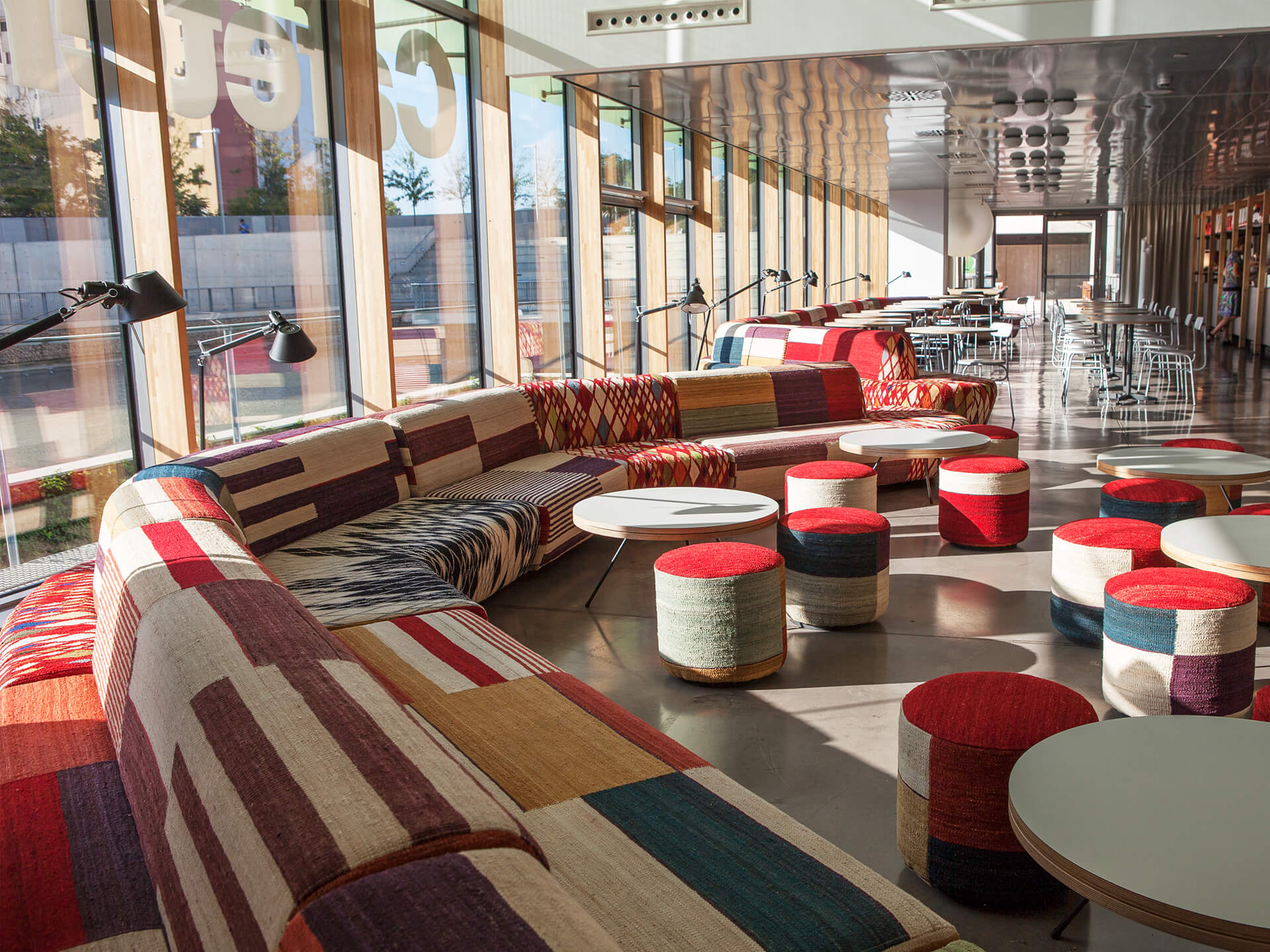 Marcos Catalán created a casual and creative space for the cafeteria for the Hub Design Center in Barcelona with a mix of prints from our most emblematic collections: Medina , Losanges, Mélange among others.
