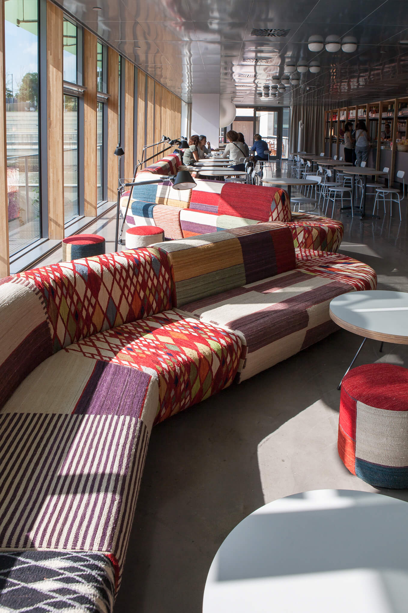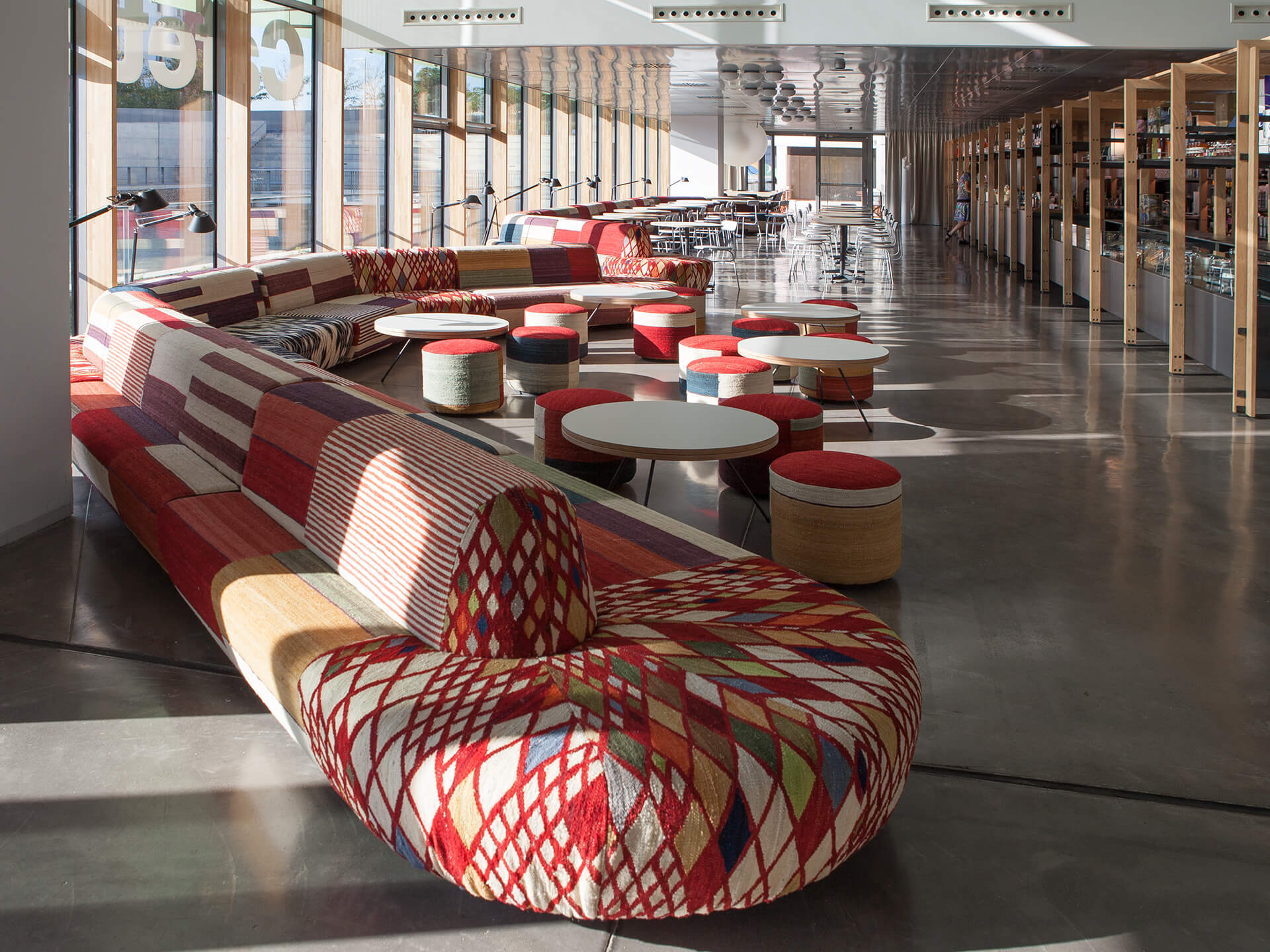 A special installation with seats upholstered with the combination of our carpets creating a great patchwork.