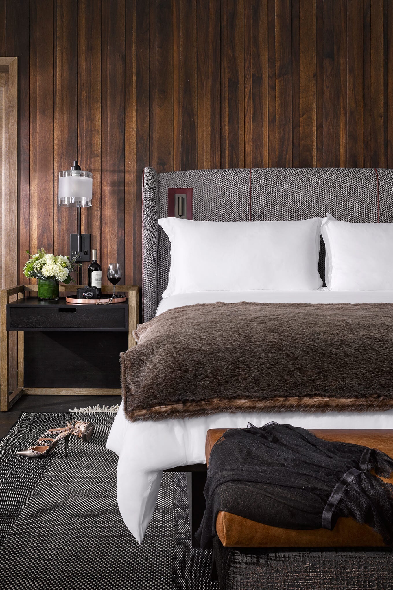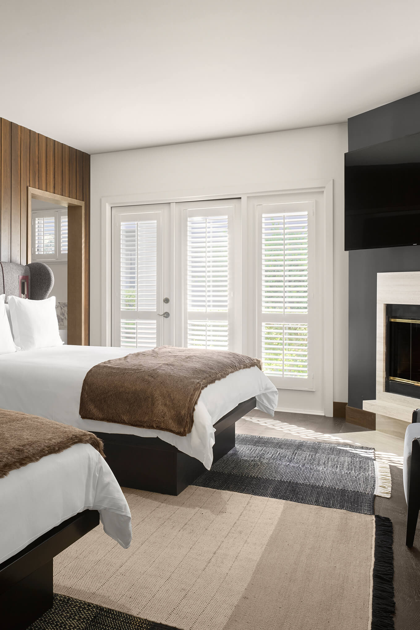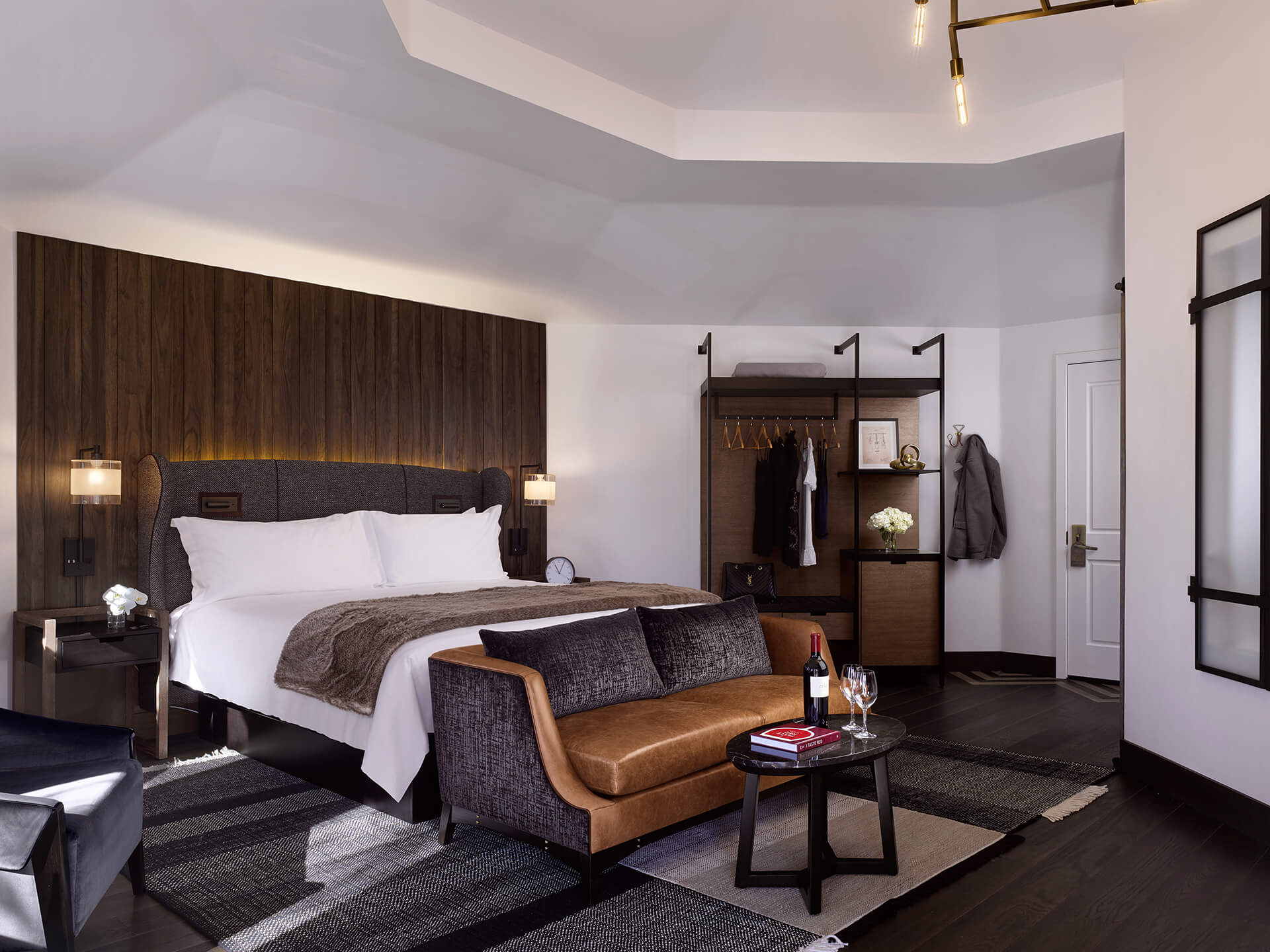 The emblematic Tres black rug by Nanimarquina is an example. Thoughtfully designed as refined retreats, the boutique hotel's rooms feature sunny terraces overlooking Napa's picturesque vineyards and The Estate's landscaped grounds.