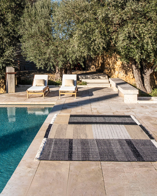An outdoor rug can also be a great companion for pool areas where we want to add color and personality.