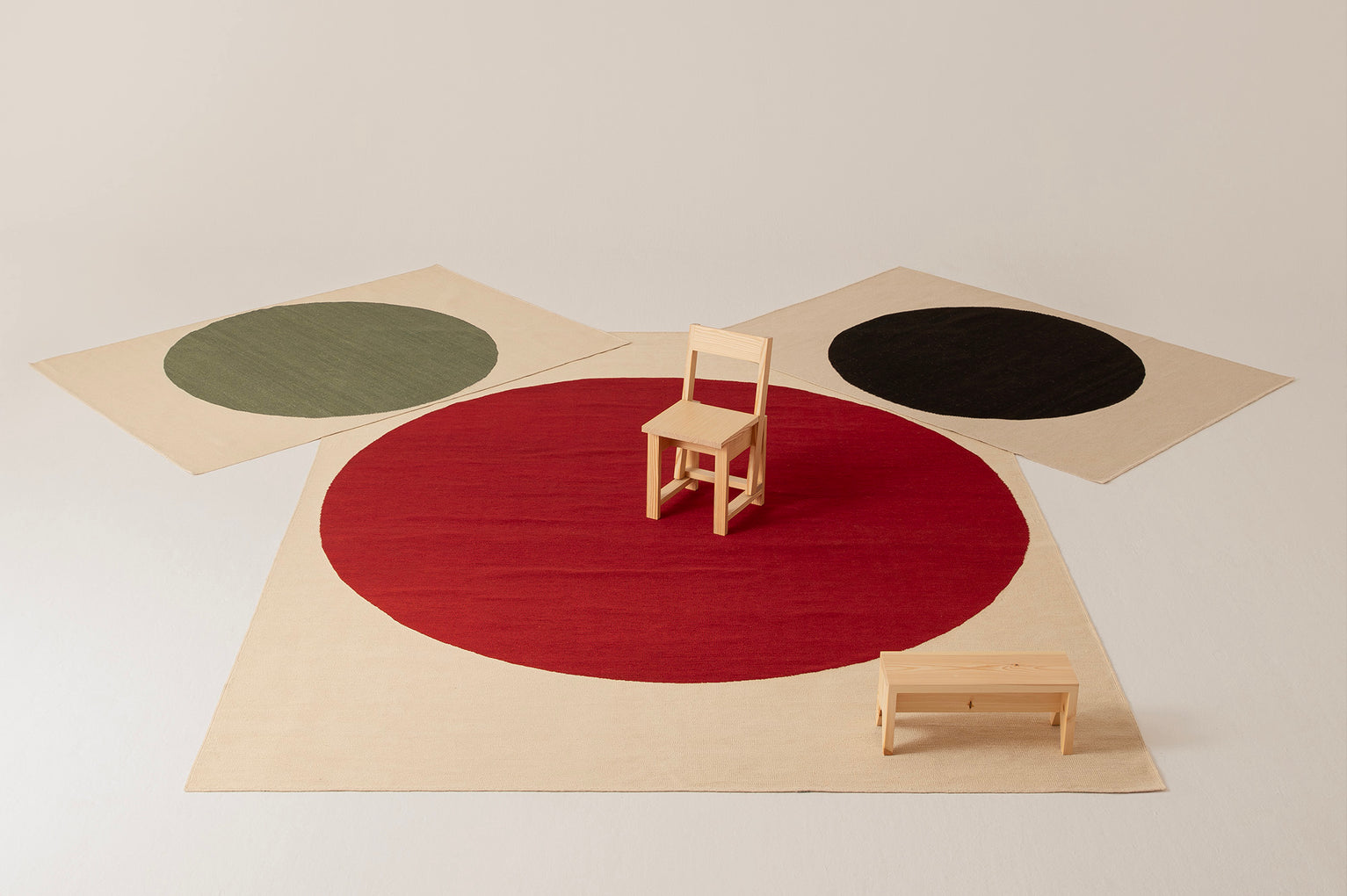 Topo is an invitation to rethink the boundaries of functional design and rediscover the beauty of the essential: a large circle, positioned at the very edge of the rectangular area. A powerful visual tension. Each Topo rug is handwoven with handspun Afghan wool. A kilim that combines textile tradition with a radically contemporary aesthetic. The collection is available in three monochromatic versions: black, green or red, always set against a raw background.