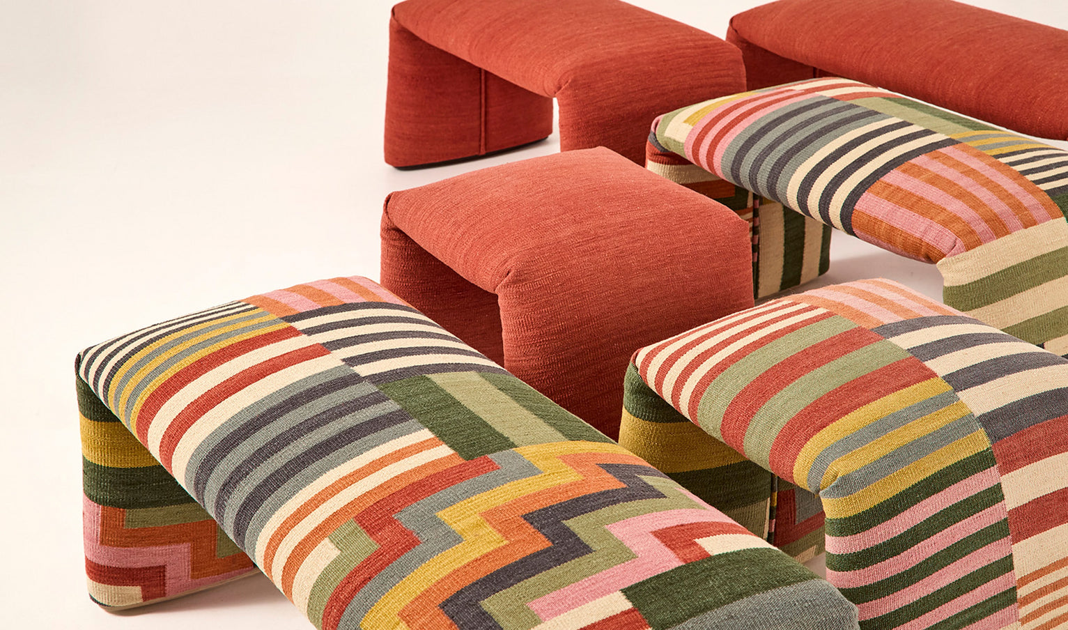 Folded, a bench that reinterprets the traditional concept of the rug, and challenges the traditional boundaries of design. Inspired by the essence of the carpet, this sculptural piece elevates its functionality beyond the floor, transforming into a practical and versatile furniture element. Both the upholstery design and the shape of the bench itself have been conceived as an inseparable duo, where functionality and expressiveness go hand in hand at all times.