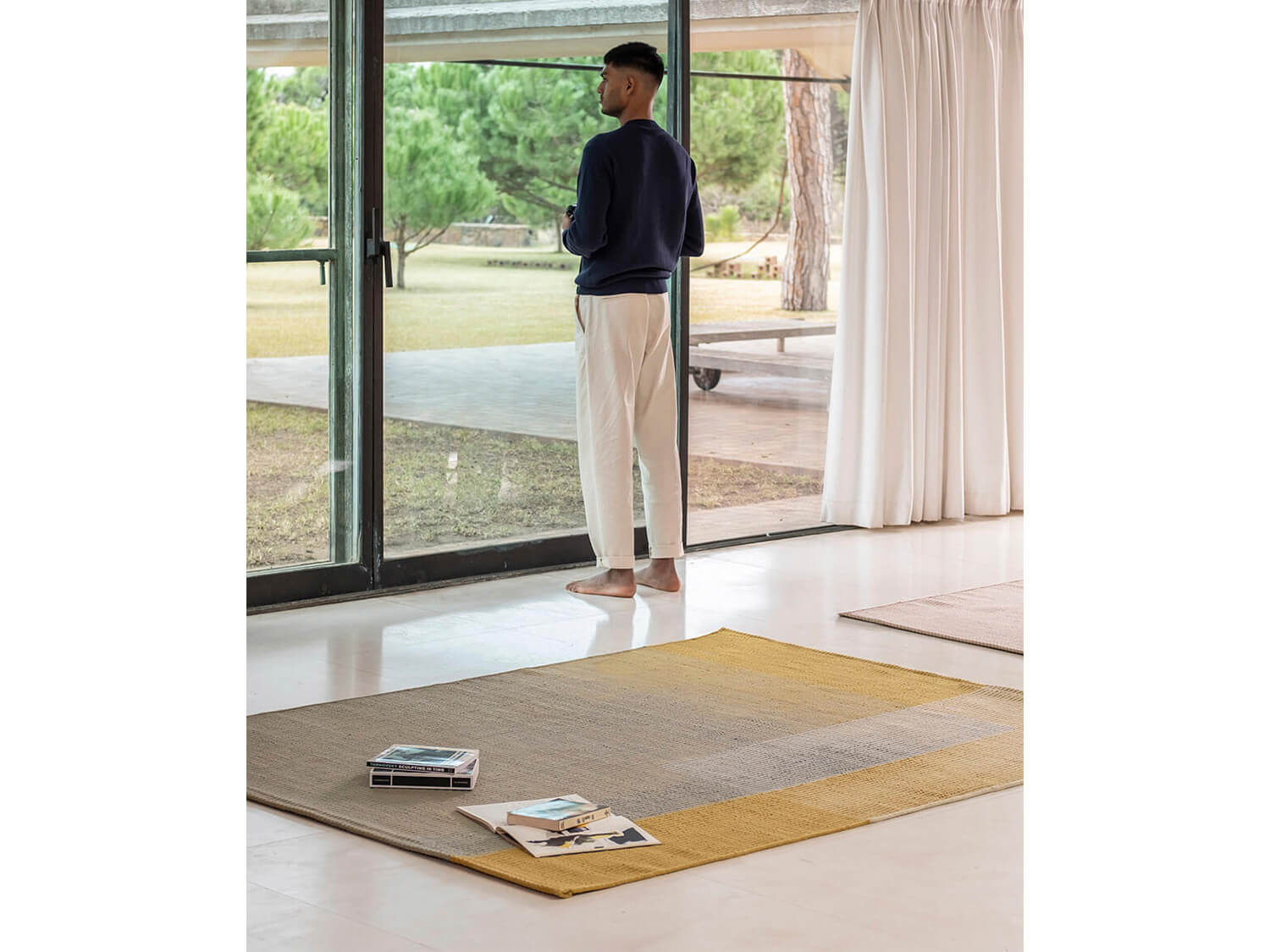 Unlike other creative processes, Haze is a rug devised directly on the loom, as the designer experimented with chromatic interactions and color fading by means of mixing colors optically.