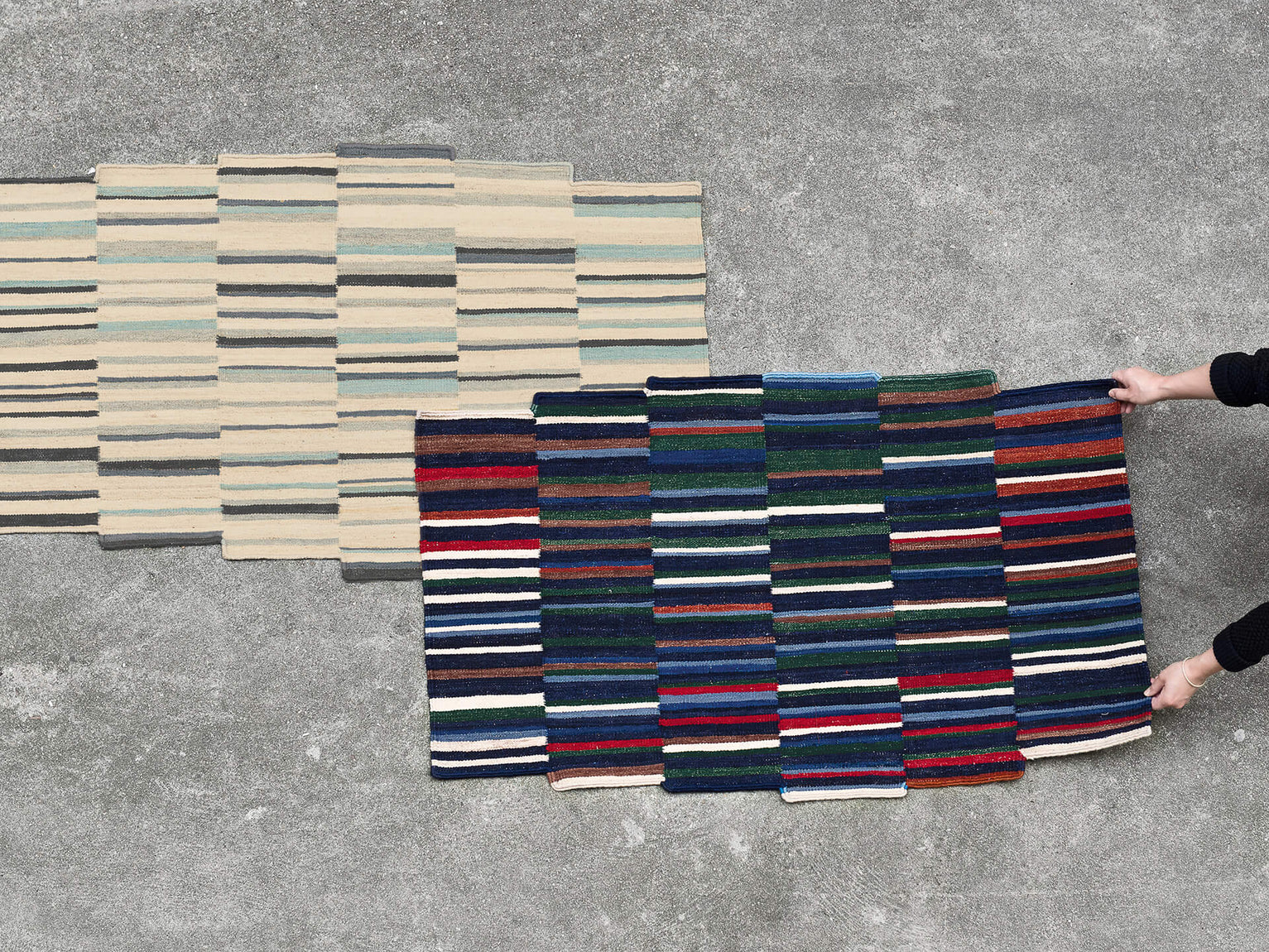 The Lattice collection is handcrafted using the ancestral, hand-loomed kilim technique and comes in four sizes, including a small, bedside version, and two colors; this one in shades of blue, red, green and cream.